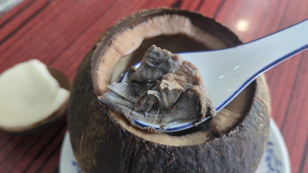 ですので、日本語に訳すとすれば、「ココナッツで丸ごと煮込んだ烏骨鶏スープ」といったところでしょうか。