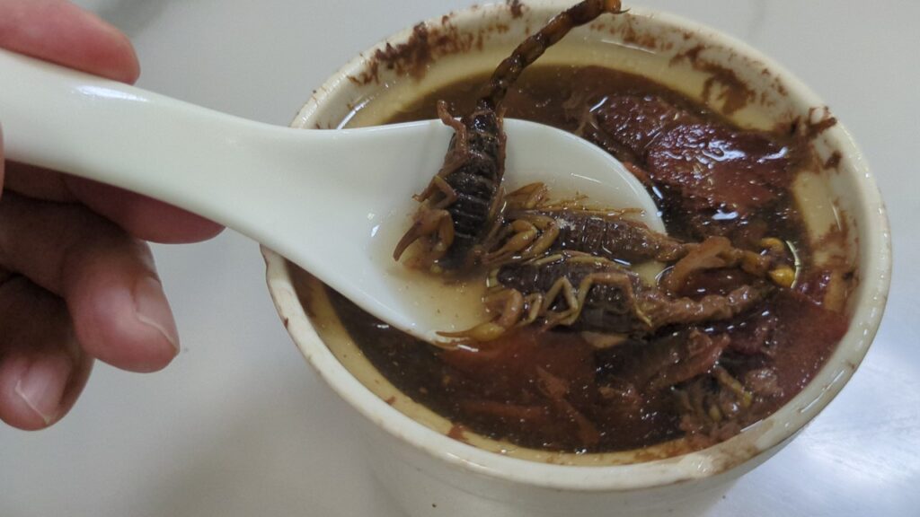 ここでは、店頭のお品書きの札の多さからわかるとおり、様々な養生スープが提供されていますが、その中でも、土茯苓瘦肉炖龟蝎(亀とサソリの薬膳煮込みスープ)は、いわゆるゲテモノ系と思われがちなサソリや亀を使用したスープですが、これらは中医学の考えのもと使用されている薬膳食材です。