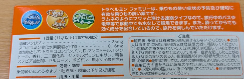 ↓スコポラミン臭化水素酸塩水和物、メクリジン塩酸塩が配合された乗物酔い防止薬