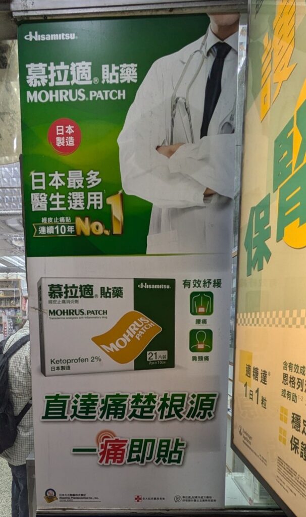 ↑香港の薬局店頭のモーラステープの広告(2024.11)と、台湾で販売されていたOTC医薬品(2024.5)